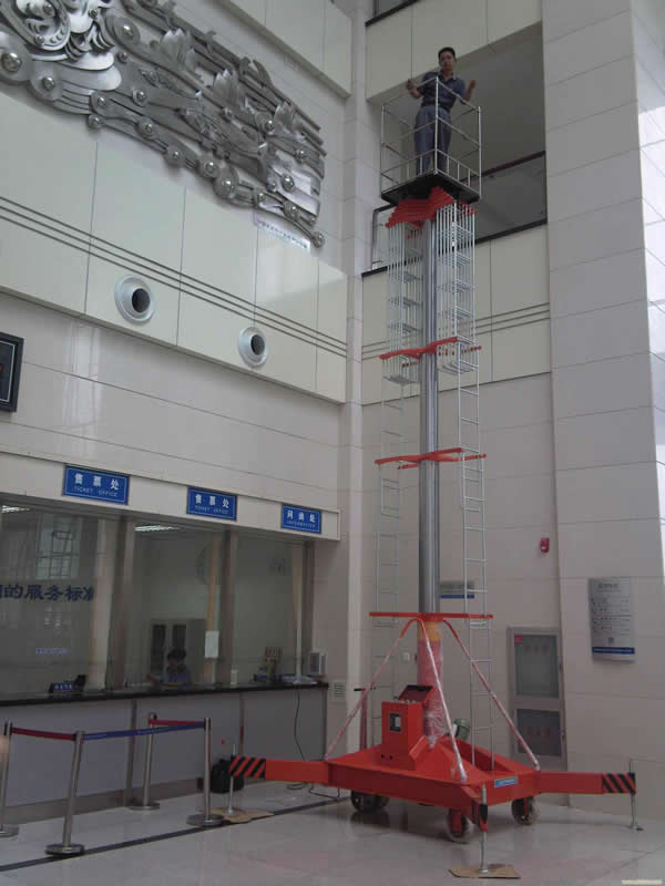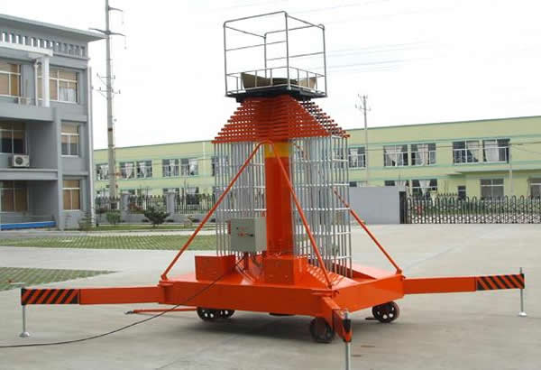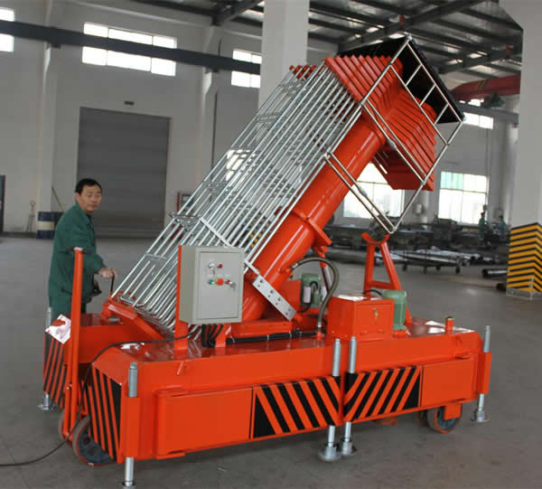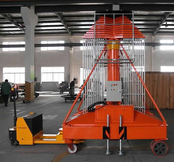套缸式升降平臺具有設(shè)計新穎,體積小,外型美觀,操作維修方便,升降平穩(wěn)等優(yōu)點。整機(jī)由平臺、伸縮油缸、單梯式或雙梯式防轉(zhuǎn)機(jī)構(gòu)、底盤油箱、支腿、行走輪等組成。平臺由伸縮油缸直接頂升,當(dāng)啟動電機(jī)時,由電機(jī)帶動齒輪泵供油,油液經(jīng)單向閥及電磁通道輸入油缸,伸縮油缸則逐節(jié)上升,當(dāng)平臺升到最大高度時,系統(tǒng)壓力也就達(dá)到了額定工作壓力。